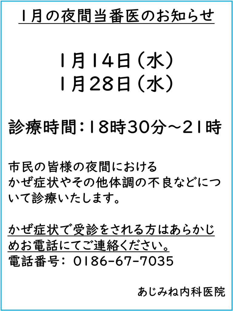 1月の夜間当番医のお知らせ 2025年12月29日 最終更新日時 : 2025年12月29日 user 1月の夜間当番の日程は以下の通りになります。 夜間当番医日程表(北秋田市のホームページになります)